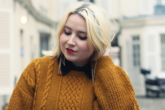 Très jolie couleur pour le pull et tes boucles d'oreilles sont très sympas !