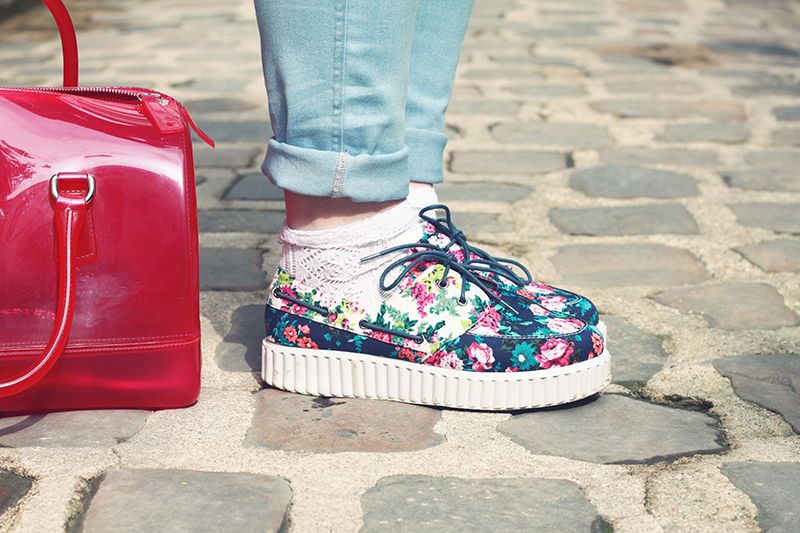 Uncategorized Florals ? For spring ? Ground breaking. Pink and roses, we can’t do better for a spring outfit, can we ? I’m wearing an American Apparel blouse and jean, a Me & Zena ring, Urban Outfitters‘s « boat » creepers shoes and a Furla‘s CandyBag.