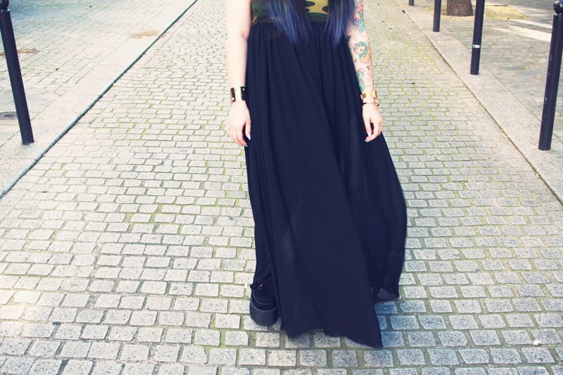 @Gogo : Je trouve que le genre de la robe clouté+camouflage en plus de la jupe même si ça ne se voit pas qui est totalement transparente ça ne faisait pas joli avec des talons d'ou mon choix des creepers les plus hautes 🙂