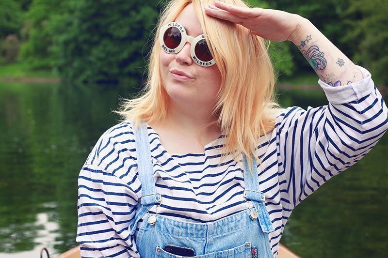 Je porte des lunettes Wildfox, un haut rayé et une salopette vintage,