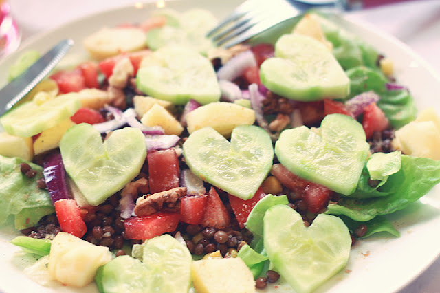 Here my salad of the moment : lettuce, tomato, lentils, red onion, apple, walnut and cucumber.